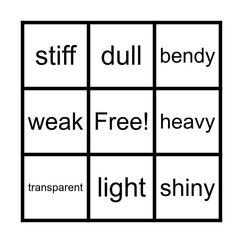 This bingo card has a free space and 17 words: hard, soft, bendy, stiff, strong, weak, opaque, transparent, light, heavy, smooth, rough, shiny, dull, waterproof, absorbent and flexible.