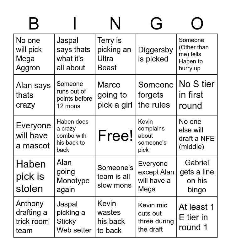 This bingo card has a free space and 24 words: Alan going Monotype again, Jaspal picking a Sticky Web setter, Marco going to pick a girl, Anthony drafting a trick room team, Someone (Other than me) tells Haben to hurry up, No one will pick Mega Aggron, Alan says thats crazy, Jaspal says thats what it's all about, Kevin complains about someone's pick, Someone's team is all slow mons, Someone forgets the rules, Everyone will have a mascot, Everyone except Alan will have a Mega, Gabriel gets a line on his bingo, Someone runs out of points before 12 mons, Kevin mic cuts out three during the draft, No one else will draft a NFE (middle), Terry is picking an Ultra Beast, No S tier in first round, Haben does a crazy combo with his back to back, At least 1 E tier in round 1, Haben pick is stolen, Diggersby is picked and Kevin wastes his back to back.