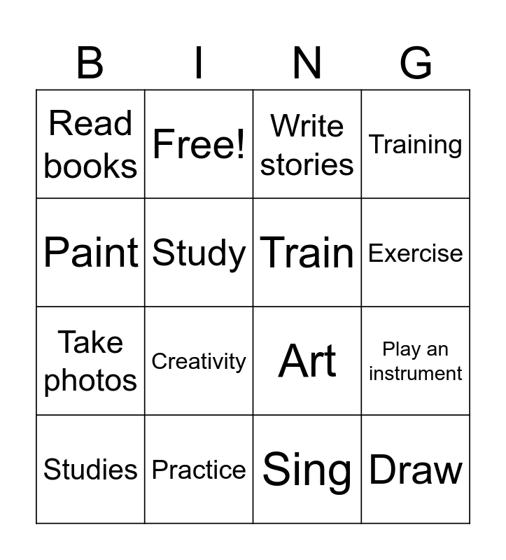 This bingo card has 19 words: Art, Dance, Write stories, Draw, Play an instrument, Paint, Sing, Read books, Free!, Take photos, Creativity, Study, Train, Practice, Studies, Practise, Training, Exercise and Dragon.