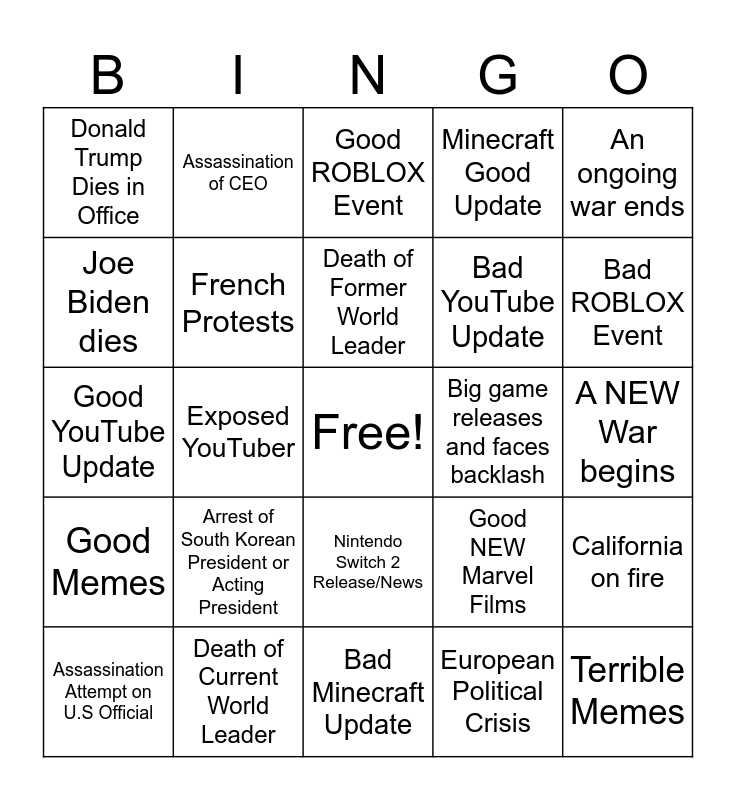 This bingo card has a free space and 24 words: Arrest of South Korean President or Acting President, Death of Current World Leader, Death of Former World Leader, Assassination Attempt on U.S Official, An ongoing war ends, Donald Trump Dies in Office, Joe Biden dies, Assassination of CEO, Big game releases and faces backlash, Nintendo Switch 2 Release/News, Bad YouTube Update, Good YouTube Update, Good NEW Marvel Films, California on fire, French Protests, European Political Crisis, A NEW War begins, Good ROBLOX Event, Bad ROBLOX Event, Exposed YouTuber, Terrible Memes, Good Memes, Minecraft Good Update and Bad Minecraft Update.