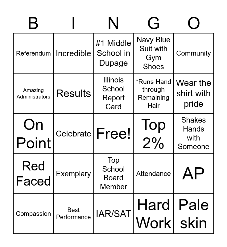 This bingo card has a free space and 24 words: Exemplary, Best Performance, Illinois School Report Card, Compassion, Community, Referendum, Amazing Administrators, Incredible, Top 2%, Top School Board Member, *Runs Hand through Remaining Hair, On Point, Attendance, AP, Results, Hard Work, Shakes Hands with Someone, #1 Middle School in Dupage, Wear the shirt with pride, Celebrate, Pale skin, Red Faced, Navy Blue Suit with Gym Shoes and IAR/SAT.