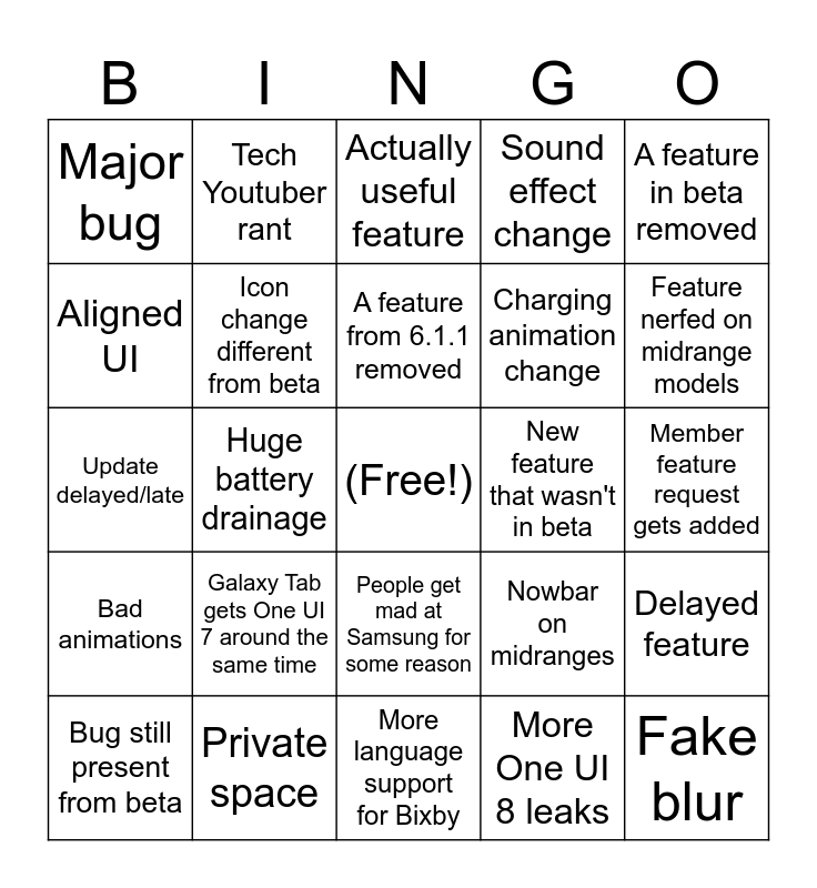 This bingo card has a free space and 24 words: Bug still present from beta, Galaxy Tab gets One UI 7 around the same time, A feature from 6.1.1 removed, More One UI 8 leaks, A feature in beta removed, Major bug, Tech Youtuber rant, Actually useful feature, New feature that wasn't in beta, Member feature request gets added, Update delayed/late, Icon change different from beta, Nowbar on midranges, Delayed feature, Aligned UI, Private space, More language support for Bixby, Sound effect change, Feature nerfed on midrange models, Bad animations, Huge battery drainage, People get mad at Samsung for some reason, Charging animation change and Fake blur.