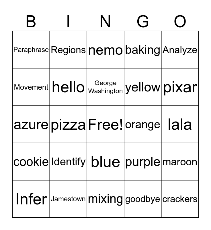 This bingo card has a free space and 24 words: Identify, Jamestown, George Washington, Infer, Analyze, Paraphrase, Movement, Regions, orange, blue, yellow, azure, purple, maroon, hello, goodbye, lala, nemo, pixar, pizza, crackers, cookie, baking and mixing.
