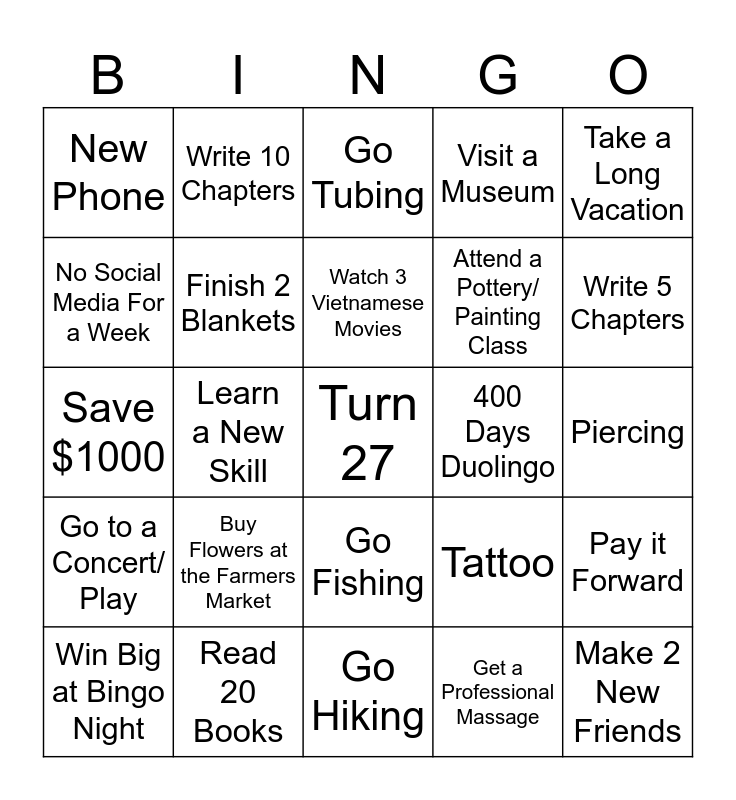 This bingo card has a free space and 24 words: Win Big at Bingo Night, Buy Flowers at the Farmers Market, Watch 3 Vietnamese Movies, Get a Professional Massage, Take a Long Vacation, New Phone, Write 10 Chapters, Go Tubing, 400 Days Duolingo, Piercing, Save $1000, Finish 2 Blankets, Tattoo, Pay it Forward, No Social Media For a Week, Read 20 Books, Go Hiking, Visit a Museum, Write 5 Chapters, Go to a Concert/ Play, Learn a New Skill, Go Fishing, Attend a Pottery/ Painting Class and Make 2 New Friends.