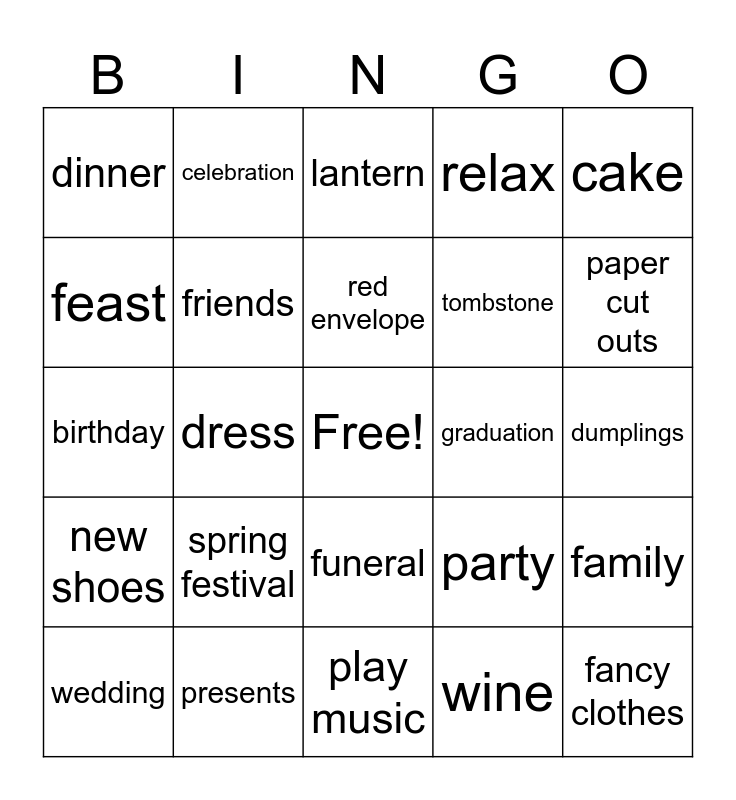 This bingo card has a free space and 24 words: spring festival, presents, red envelope, wedding, cake, dinner, feast, celebration, graduation, funeral, tombstone, birthday, party, family, friends, wine, dumplings, lantern, paper cut outs, dress, fancy clothes, new shoes, relax and play music.