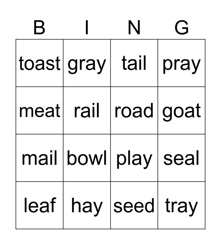 This bingo card has 28 words: rain, train, mail, nail, rail, tail, gray, tray, hay, clay, play, pray, blow, yellow, bowl, boat, soap, road, goat, snow, toast, peanut, leaf, seal, seed, green, meat and sea.