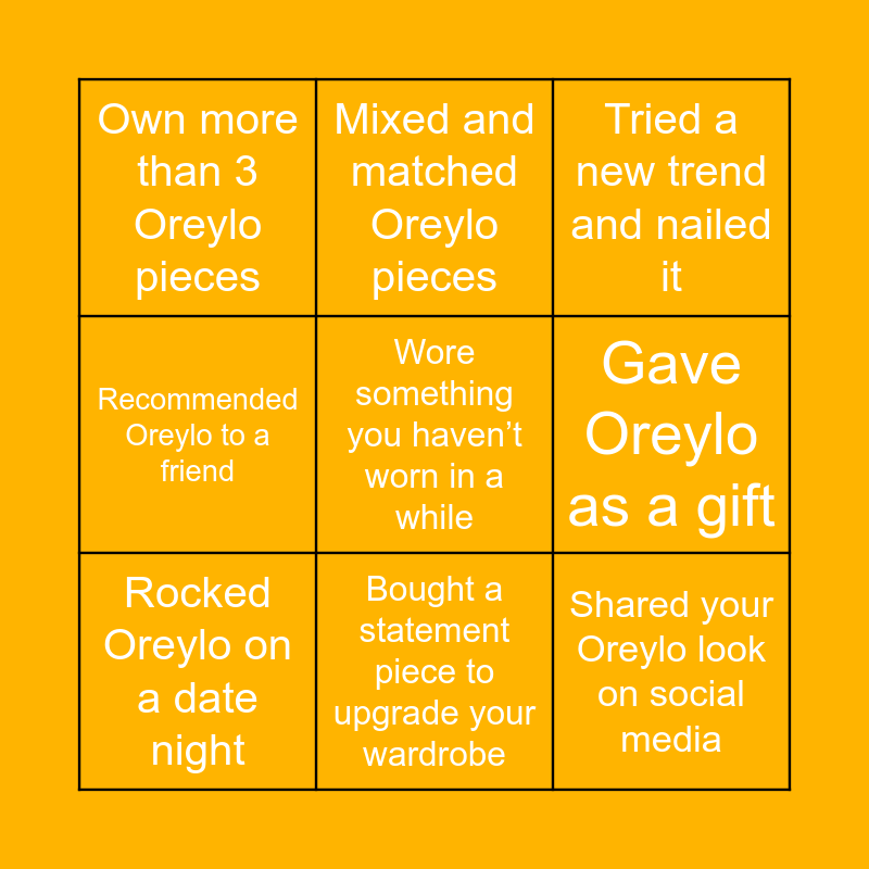 This bingo card has 9 words: Rocked Oreylo on a date night, Tried a new trend and nailed it, Mixed and matched Oreylo pieces, Recommended Oreylo to a friend, Own more than 3 Oreylo pieces, Gave Oreylo as a gift, Wore something you haven’t worn in a while, Shared your Oreylo look on social media and Bought a statement piece to upgrade your wardrobe.