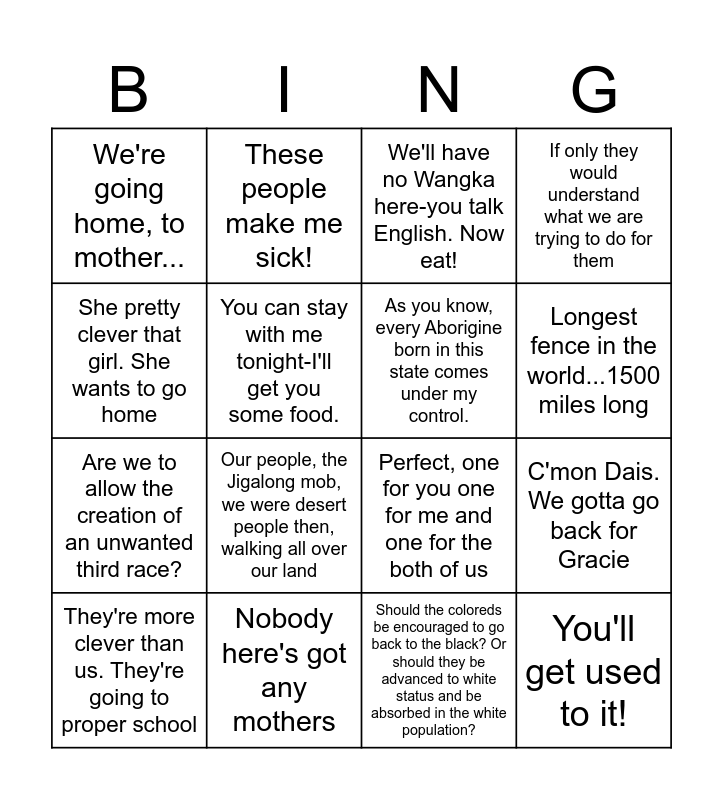 This bingo card has 16 words: Nobody here's got any mothers, C'mon Dais. We gotta go back for Gracie, We'll have no Wangka here-you talk English. Now eat!, We're going home, to mother..., Are we to allow the creation of an unwanted third race?, These people make me sick!, Perfect, one for you one for me and one for the both of us, Should the coloreds be encouraged to go back to the black? Or should they be advanced to white status and be absorbed in the white population?, She pretty clever that girl. She wants to go home, You can stay with me tonight-I'll get you some food., They're more clever than us. They're going to proper school, If only they would understand what we are trying to do for them, Our people, the Jigalong mob, we were desert people then, walking all over our land, Longest fence in the world...1500 miles long, As you know, every Aborigine born in this state comes under my control. and You'll get used to it!.