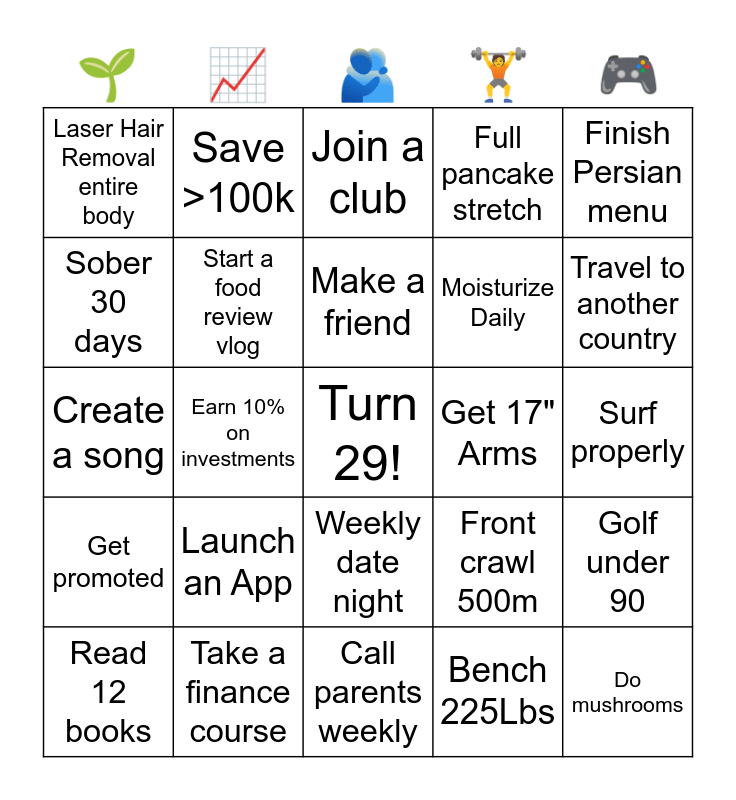 This bingo card has a free space and 24 words: Read 12 books, Launch an App, Make a friend, Bench 225Lbs, Finish Persian menu, Laser Hair Removal entire body, Save >100k, Join a club, Get 17" Arms, Surf properly, Create a song, Start a food review vlog, Front crawl 500m, Golf under 90, Sober 30 days, Take a finance course, Call parents weekly, Full pancake stretch, Travel to another country, Get promoted, Earn 10% on investments, Weekly date night, Moisturize Daily and Do mushrooms.