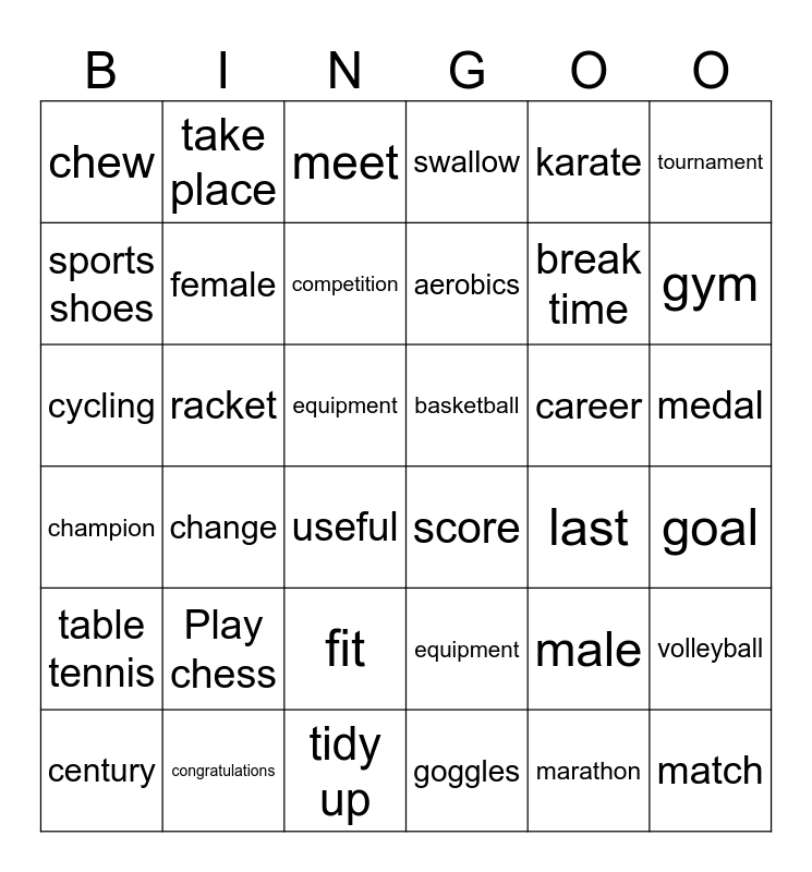 This bingo card has 36 words: equipment, fit, goggles, sports shoes, champion, basketball, female, tidy up, karate, male, gym, swallow, volleyball, racket, aerobics, chew, table tennis, career, cycling, meet, equipment, change, score, useful, last, take place, break time, congratulations, competition, tournament, match, century, goal, medal, Play chess and marathon.
