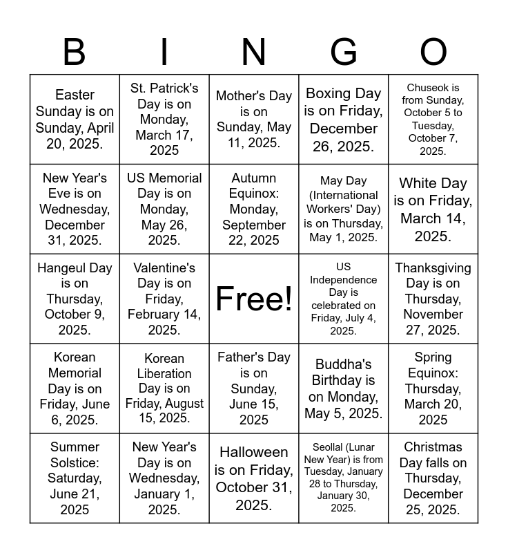 This bingo card has a free space and 30 words: New Year's Day is on Wednesday, January 1, 2025., Martin Luther King Jr. Day falls on Monday, January 20, 2025., Valentine's Day is on Friday, February 14, 2025., Presidents' Day is observed on Monday, February 17, 2025., Easter Sunday is on Sunday, April 20, 2025., Mother's Day is on Sunday, May 11, 2025., US Memorial Day is on Monday, May 26, 2025., Father's Day is on Sunday, June 15, 2025, US Independence Day is celebrated on Friday, July 4, 2025., Halloween is on Friday, October 31, 2025., Thanksgiving Day is on Thursday, November 27, 2025., Christmas Day falls on Thursday, December 25, 2025., Seollal (Lunar New Year) is from Tuesday, January 28 to Thursday, January 30, 2025., Independence Movement Day (삼일절) is on Saturday, March 1, 2025., White Day is on Friday, March 14, 2025., Children's Day is on Monday, May 5, 2025., Buddha's Birthday is on Monday, May 5, 2025., Korean Memorial Day is on Friday, June 6, 2025., Korean Liberation Day is on Friday, August 15, 2025., Chuseok is from Sunday, October 5 to Tuesday, October 7, 2025., Hangeul Day is on Thursday, October 9, 2025., Pepero Day is on Tuesday, November 11, 2025., St. Patrick's Day is on Monday, March 17, 2025, May Day (International Workers' Day) is on Thursday, May 1, 2025., New Year's Eve is on Wednesday, December 31, 2025., Boxing Day is on Friday, December 26, 2025., Spring Equinox: Thursday, March 20, 2025, Summer Solstice: Saturday, June 21, 2025, Autumn Equinox: Monday, September 22, 2025 and Winter Solstice: Sunday, December 21, 2025.