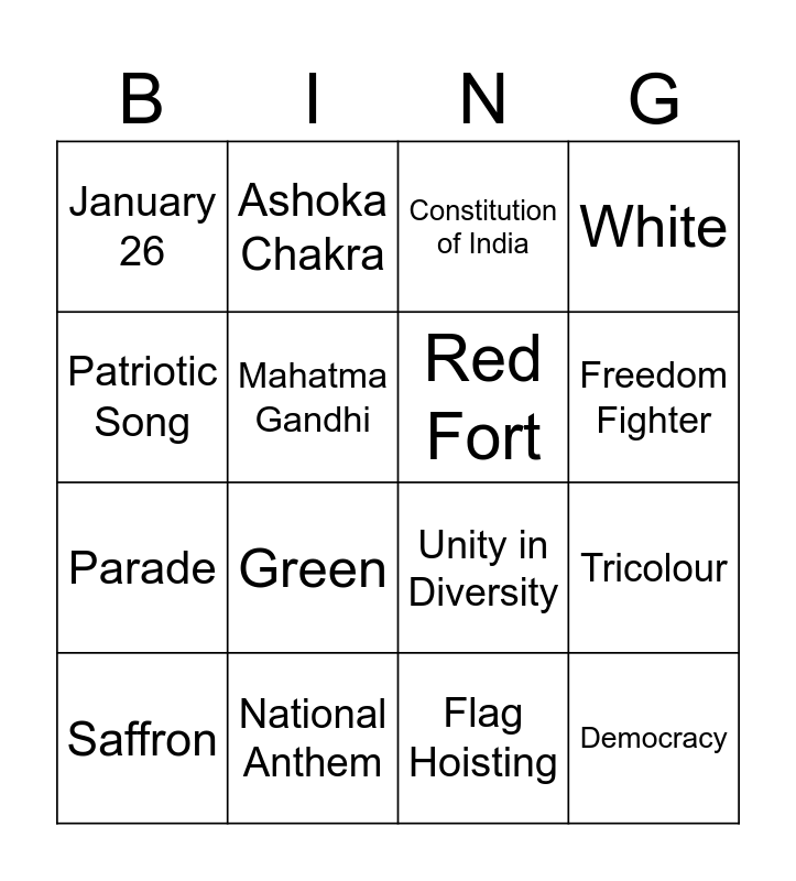 This bingo card has 16 words: National Anthem, Tricolour, Constitution of India, January 26, Parade, Ashoka Chakra, Unity in Diversity, Flag Hoisting, Patriotic Song, Mahatma Gandhi, Saffron, White, Green, Freedom Fighter, Red Fort and Democracy.