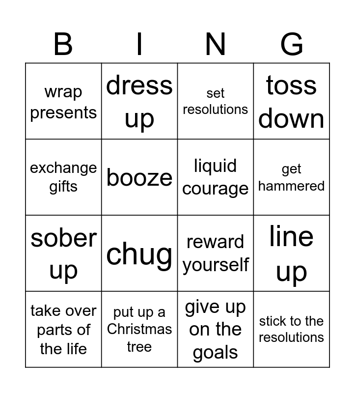 This bingo card has 16 words: put up a Christmas tree, line up, set resolutions, wrap presents, sober up, dress up, reward yourself, give up on the goals, exchange gifts, booze, take over parts of the life, toss down, chug, get hammered, liquid courage and stick to the resolutions.