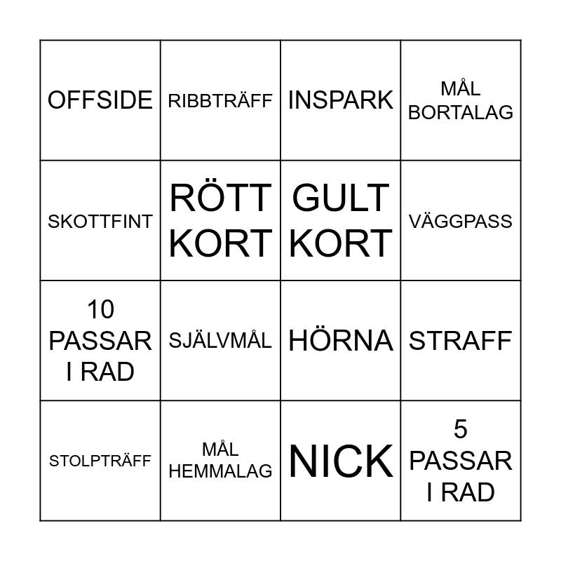 This bingo card has 16 words: MÅL HEMMALAG, STRAFF, INSPARK, OFFSIDE, 10 PASSAR I RAD, RIBBTRÄFF, HÖRNA, NICK, SKOTTFINT, RÖTT KORT, STOLPTRÄFF, MÅL BORTALAG, SJÄLVMÅL, VÄGGPASS, GULT KORT and 5 PASSAR I RAD.