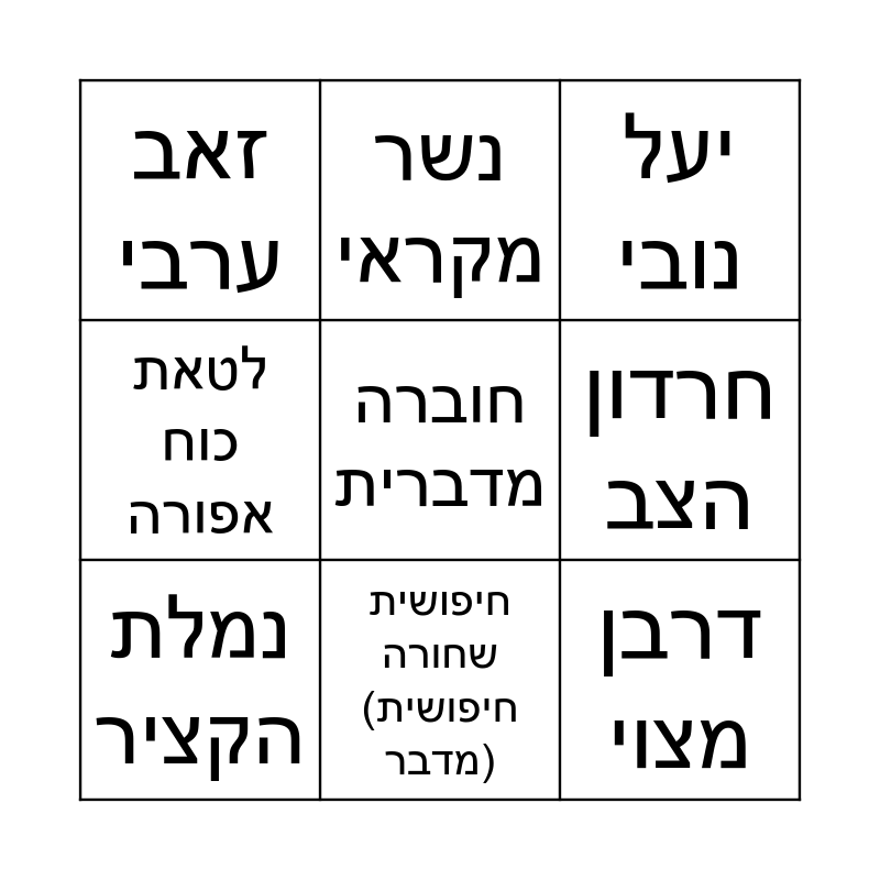 This bingo card has 16 words: גמל, שועל פנק, יעל נובי, זאב ערבי, דרבן מצוי, נשר מקראי, כוס חורבות, עורב חום-עורף, חוברה מדברית, חרדון הצב, צפע מצוי, לטאת כוח אפורה, שממית מדבר, חיפושית שחורה (חיפושית מדבר), נמלת הקציר and עקרב צהוב.