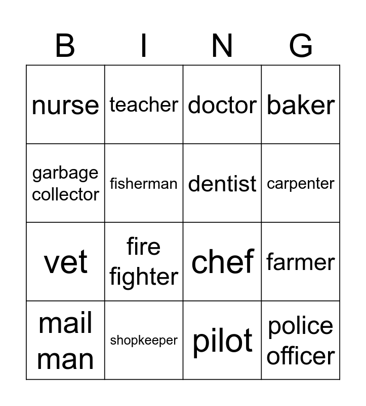 This bingo card has 18 words: fire fighter, police officer, doctor, nurse, chef, baker, mail man, teacher, carpenter, vet, pilot, garbage collector, farmer, fisherman, dentist, solider, shopkeeper and astronaut.