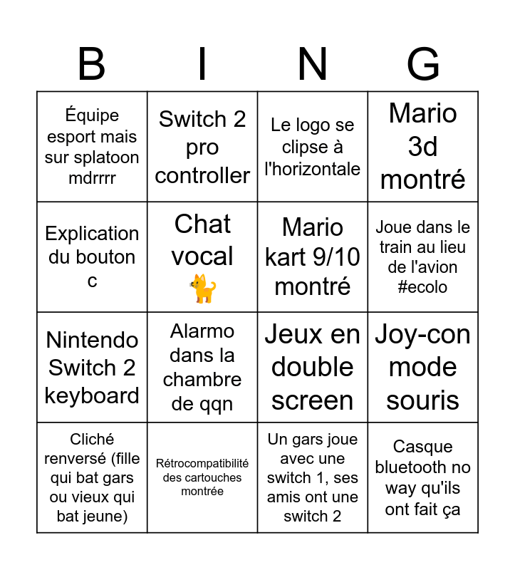 This bingo card has 16 words: Rétrocompatibilité des cartouches montrée, Joy-con mode souris, Le logo se clipse à l'horizontale, Équipe esport mais sur splatoon mdrrrr, Nintendo Switch 2 keyboard, Switch 2 pro controller, Jeux en double screen, Un gars joue avec une switch 1, ses amis ont une switch 2, Explication du bouton c, Chat vocal 🐈, Cliché renversé (fille qui bat gars ou vieux qui bat jeune), Mario 3d montré, Alarmo dans la chambre de qqn, Joue dans le train au lieu de l'avion #ecolo, Mario kart 9/10 montré and Casque bluetooth no way qu'ils ont fait ça.