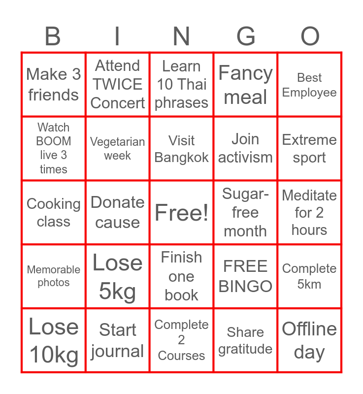 This bingo card has a free space and 25 words: Lose 5kg, Complete 2 Courses, Visit Bangkok, Lose 10kg, Best Employee, Make 3 friends, Watch BOOM live 3 times, Attend TWICE Concert, Sugar-free month, Finish one book, Join activism, Cooking class, FREE BINGO, Complete 5km, Vegetarian week, Solo day-trip, Meditate for 2 hours, Learn 10 Thai phrases, Extreme sport, Donate cause, Offline day, Start journal, Memorable photos, Fancy meal and Share gratitude.