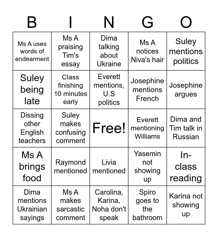 This bingo card has a free space and 24 words: Raymond mentioned, Ms A makes sarcastic comment, Everett mentions, U.S politics, Dima mentions Ukrainian sayings, Suley mentions politics, Ms A uses words of endearment, Suley being late, Ms A praising Tim's essay, Everett mentioning Williams, Livia mentioned, Josephine mentions French, Dissing other English teachers, Yasemin not showing up, In-class reading, Class finishing 10 minutes early, Spiro goes to the bathroom, Dima and Tim talk in Russian, Dima talking about Ukraine, Josephine argues, Suley makes confusing comment, Karina not showing up, Ms A brings food, Ms A notices Niva's hair and Carolina, Karina, Noha don't speak.