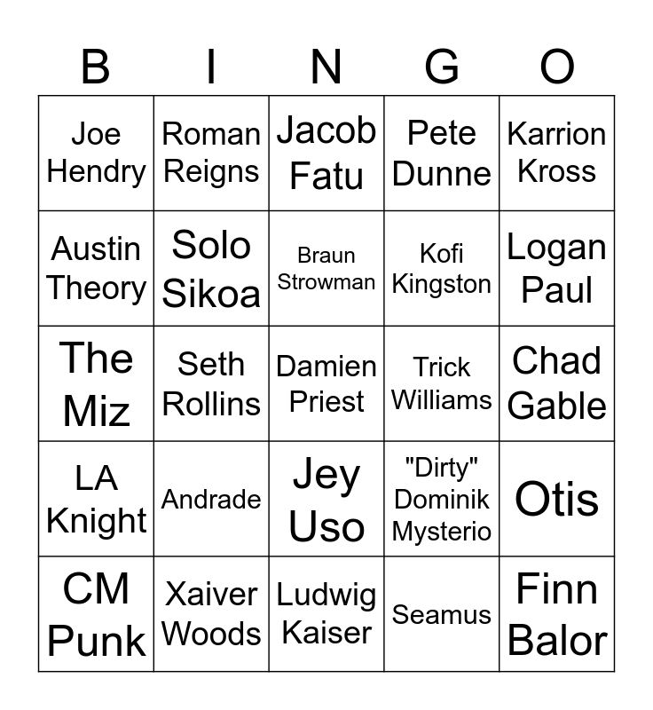 This bingo card has a free space and 29 words: CM Punk, John Cena, Seth Rollins, Drew McIntyre, Joe Hendry, Jacob Fatu, Solo Sikoa, Andrade, Trick Williams, Xaiver Woods, Chad Gable, Finn Balor, Ludwig Kaiser, Seamus, Logan Paul, Carmelo Hayes, Jey Uso, LA Knight, Karrion Kross, The Miz, "Dirty" Dominik Mysterio, Montez Ford, Kofi Kingston, Austin Theory, Pete Dunne, Roman Reigns, Otis, Braun Strowman and Bo Dallas.