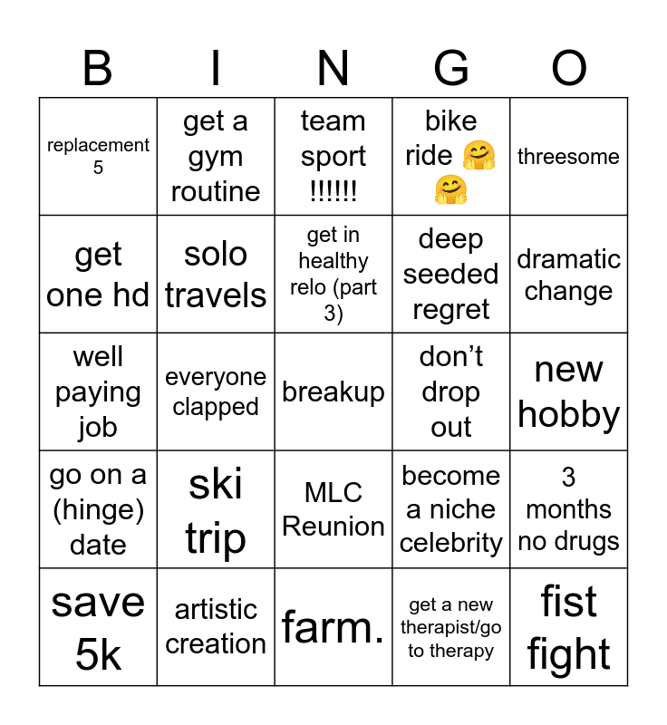 This bingo card has a free space and 24 words: ski trip, artistic creation, get in healthy relo (part 3), save 5k, threesome, replacement 5, get one hd, get a gym routine, don’t drop out, MLC Reunion, deep seeded regret, well paying job, become a niche celebrity, 3 months no drugs, solo travels, get a new therapist/go to therapy, new hobby, team sport !!!!!!, dramatic change, everyone clapped, fist fight, go on a (hinge) date, bike ride 🤗🤗 and farm..
