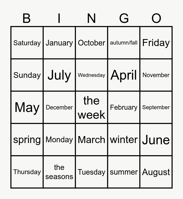This bingo card has 25 words: Monday, Tuesday, Wednesday, Thursday, Friday, Saturday, Sunday, January, February, March, April, May, winter, June, July, August, September, October, November, December, the week, the seasons, spring, autumn/fall and summer.