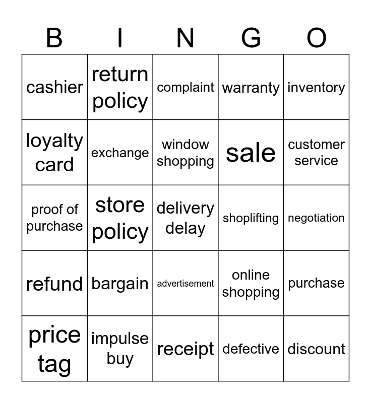 This bingo card has a free space and 24 words: bargain, impulse buy, window shopping, price tag, inventory, cashier, loyalty card, return policy, shoplifting, advertisement, sale, proof of purchase, online shopping, purchase, exchange, defective, negotiation, complaint, customer service, store policy, discount, refund, warranty and receipt.