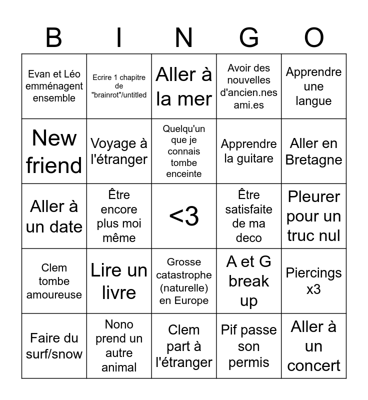 This bingo card has a free space and 25 words: Clem tombe amoureuse, Nono prend un autre animal, Clem part à l'étranger, Pif passe son permis, Apprendre une langue, Evan et Léo emménagent ensemble, Ecrire 1 chapitre de "brainrot"/untitled, Aller à la mer, Être satisfaite de ma deco, Piercings x3, New friend, Voyage à l'étranger, <3, A et G break up, Aller en Bretagne, Faire du surf/snow, Être encore plus moi même, Quelqu'un que je connais tombe enceinte, Apprendre la guitare, Pleurer pour un truc nul, Aller à un date, Lire un livre, Grosse catastrophe (naturelle) en Europe, Avoir des nouvelles d'ancien.nes ami.es and Aller à un concert.