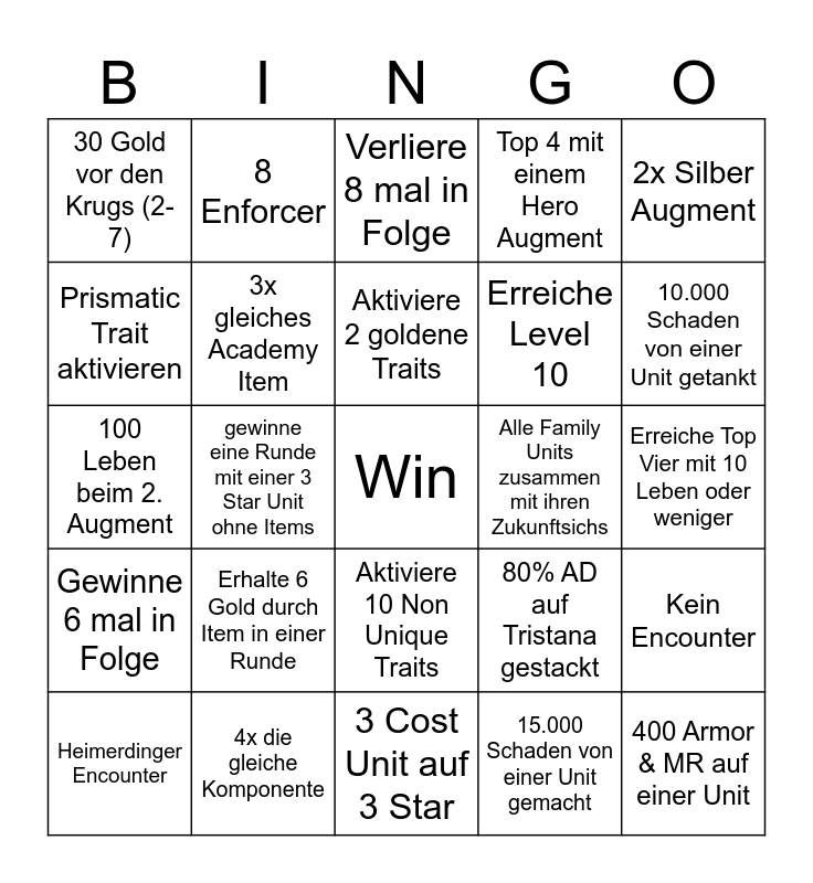 This bingo card has a free space and 24 words: Erhalte 6 Gold durch Item in einer Runde, 4x die gleiche Komponente, Aktiviere 2 goldene Traits, Heimerdinger Encounter, 2x Silber Augment, 30 Gold vor den Krugs (2-7), Prismatic Trait aktivieren, 8 Enforcer, Alle Family Units zusammen mit ihren Zukunftsichs, Aktiviere 10 Non Unique Traits, Erreiche Level 10, 100 Leben beim 2. Augment, 80% AD auf Tristana gestackt, Kein Encounter, 3x gleiches Academy Item, 15.000 Schaden von einer Unit gemacht, Erreiche Top Vier mit 10 Leben oder weniger, Verliere 8 mal in Folge, 10.000 Schaden von einer Unit getankt, gewinne eine Runde mit einer 3 Star Unit ohne Items, 400 Armor & MR auf einer Unit, Gewinne 6 mal in Folge, Top 4 mit einem Hero Augment and 3 Cost Unit auf 3 Star.
