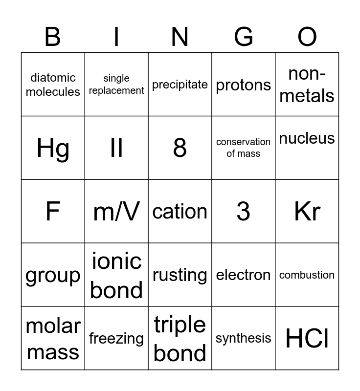 This bingo card has 40 words: -2, F, chlorine, II, freezing, rusting, 8, alkali metals, non-metals, group, m/V, protons, cation, Kr, 3, ionic bond, double bond, diatomic molecules, aqueous, precipitate, combustion, synthesis, conservation of mass, Hg, Mn, Mg, 1, sulfate, HCl, period, carbon, molar mass, neutron, electron, nucleus, triple bond, roman numerals, greek prefixes, single replacement and wipe down the lab table.
