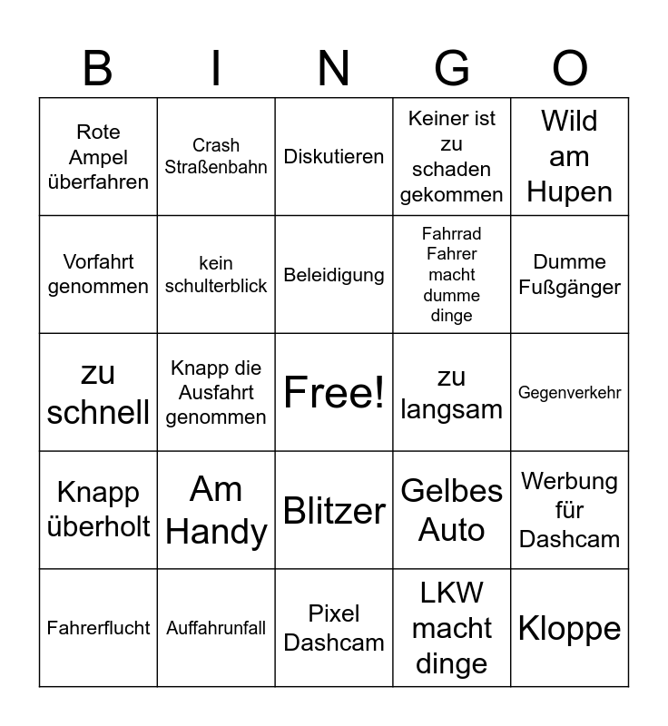This bingo card has a free space and 24 words: Am Handy, Auffahrunfall, Beleidigung, Fahrerflucht, Wild am Hupen, Rote Ampel überfahren, Vorfahrt genommen, Crash Straßenbahn, zu langsam, Blitzer, Fahrrad Fahrer macht dumme dinge, zu schnell, Gelbes Auto, Werbung für Dashcam, kein schulterblick, LKW macht dinge, Gegenverkehr, Diskutieren, Dumme Fußgänger, Knapp die Ausfahrt genommen, Kloppe, Knapp überholt, Keiner ist zu schaden gekommen and Pixel Dashcam.
