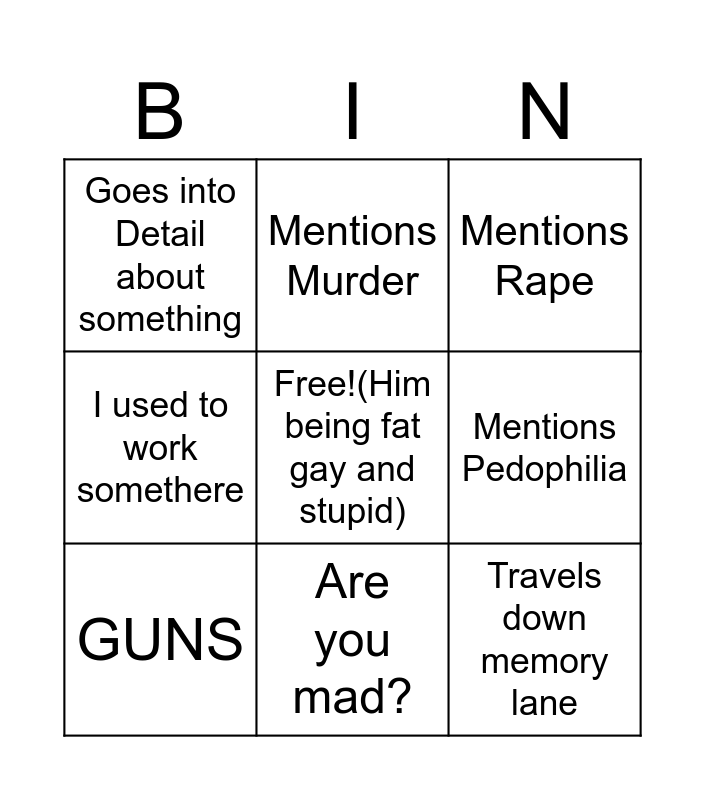 This bingo card has a free space and 8 words: Mentions Pedophilia, Mentions Rape, Mentions Murder, GUNS, Goes into Detail about something, Travels down memory lane, I used to work somethere and Are you mad?.