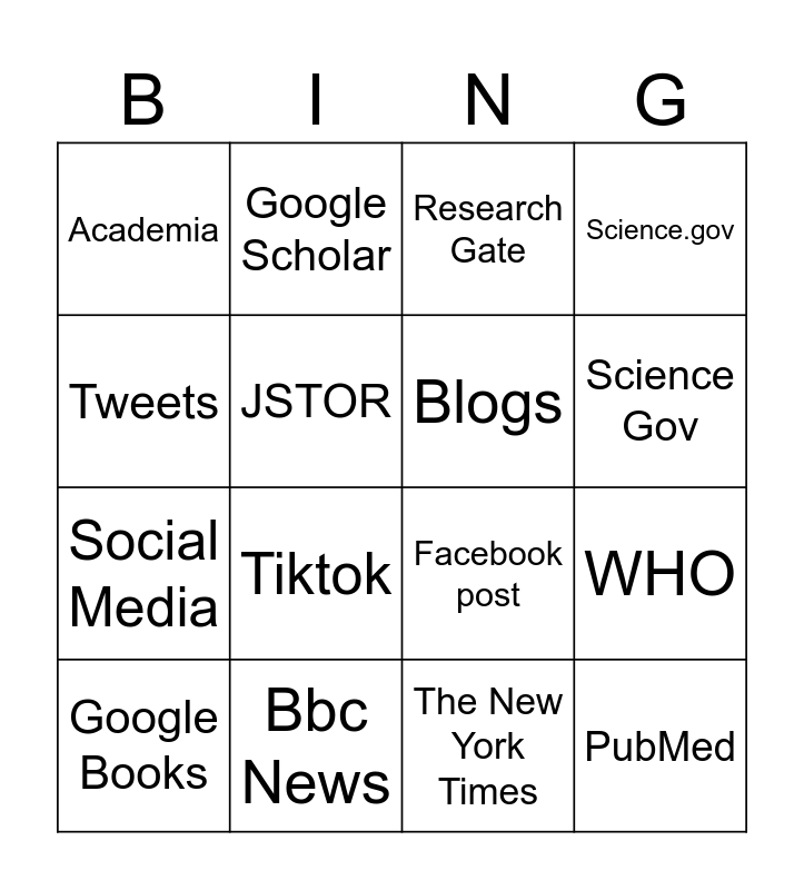 This bingo card has 16 words: Google Books, Bbc News, Research Gate, Science.gov, Tweets, Google Scholar, Facebook post, WHO, Academia, JSTOR, The New York Times, Science Gov, Social Media, Tiktok, Blogs and PubMed.