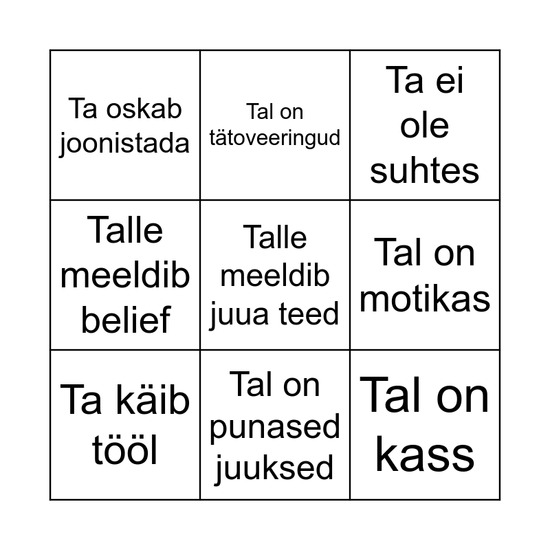 This bingo card has a free space and 8 words: Tal on motikas, Ta ei ole suhtes, Tal on tätoveeringud, Ta käib tööl, Ta oskab joonistada, Tal on kass, Talle meeldib belief and Tal on punased juuksed.