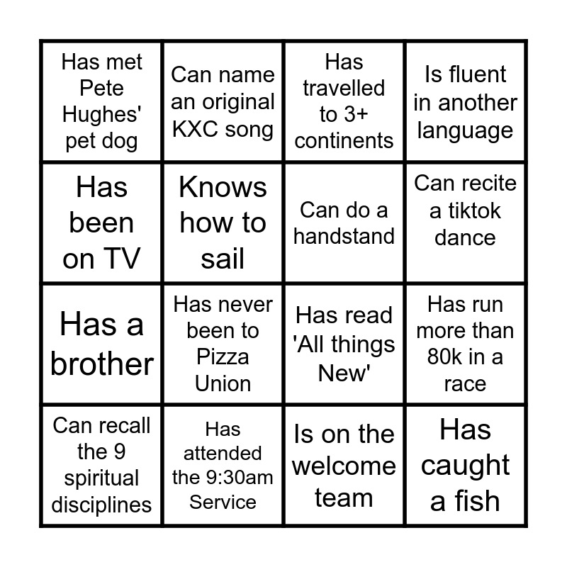 This bingo card has 16 words: Can recall the 9 spiritual disciplines, Has attended the 9:30am Service, Has travelled to 3+ continents, Is fluent in another language, Has been on TV, Can name an original KXC song, Has read 'All things New', Has run more than 80k in a race, Has met Pete Hughes' pet dog, Knows how to sail, Is on the welcome team, Can recite a tiktok dance, Has a brother, Has never been to Pizza Union, Can do a handstand and Has caught a fish.