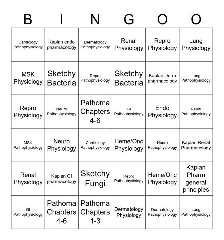 This bingo card has 70 words: Pathoma Chapters 1-3, Pathoma Chapters 4-6, Cardiology Physiology, Dermatology Physiology, Heme/Onc Physiology, Lung Physiology, Renal Physiology, Endo Physiology, Repro Physiology, GI Physiology, Neuro Physiology, MSK Physiology, Cardiology Pathophysiology, Dermatology Pathophysiology, Heme/Onc Pathophysiology, Lung Pathophysiology, Renal Pathophysiology, Repro Pathophysiology, Endo Pathophysiology, GI Pathophysiology, Neuro Pathophysiology, MSK Pathophysiology, Sketchy Bacteria, Sketchy Fungi, Kaplan Pharm general principles, Kaplan GI pharmacology, Kaplan Derm pharmacology, Kaplan Cardio Pharmacology, Kaplan Renal Pharmacology, Kaplan Repro pharmacology, Kaplan endo pharmacology, Kaplan Neuro Pharmacology, Kaplan Lung Pharmacology, Kaplan MSK Pharmacology, Pathoma Chapters 1-3, Pathoma Chapters 4-6, Cardiology Physiology, Dermatology Physiology, Heme/Onc Physiology, Lung Physiology, Renal Physiology, Endo Physiology, Repro Physiology, GI Physiology, Neuro Physiology, MSK Physiology, Cardiology Pathophysiology, Dermatology Pathophysiology, Heme/Onc Pathophysiology, Lung Pathophysiology, Renal Pathophysiology, Endo Pathophysiology, Repro Pathophysiology, GI Pathophysiology, Neuro Pathophysiology, MSK Pathophysiology, Sketchy Bacteria, Sketchy Fungi, Kaplan Pharm general principles, Kaplan GI pharmacology, Kaplan Derm pharmacology, Kaplan Cardio Pharmacology, Kaplan Renal Pharmacology, Kaplan Repro pharmacology, Kaplan endo pharmacology, Kaplan Neuro Pharmacology, Kaplan Lung Pharmacology, Kaplan MSK Pharmacology, Sketchy Viruses and Sketchy Parasites.