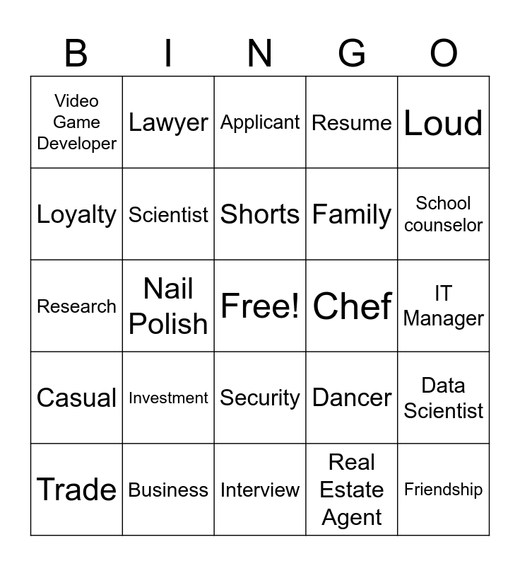 This bingo card has a free space and 24 words: Investment, Business, Shorts, Trade, Loud, Video Game Developer, Loyalty, Lawyer, Chef, Security, Family, Research, Dancer, Data Scientist, Scientist, Real Estate Agent, IT Manager, Applicant, School counselor, Nail Polish, Friendship, Casual, Resume and Interview.