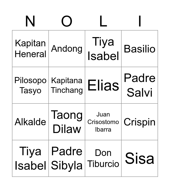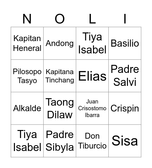 This bingo card has 41 words: Tinyente Guevarra, Juan Crisostomo Ibarra, Maria Clara, Elias, Kapitan Tiago, Padre Damaso, Padre Salvi, Don Rafael Ibarra, Pilosopo Tasyo, Sisa, Crispin, Basilio, Tiya Isabel, Don Tiburcio, Padre Sibyla, Alperes, Alperes, Kapitan Heneral, Pia Alba, Tiya Isabel, Don Saturnino, Kapitan Pablo, Don Filipo Lino, Alkalde, Pedro, Linares, Tinyente Guevarra, Nol Juan, Taong Dilaw, Lucas, Albino, Andong, Sinang, Neneng, Hermana Rufa, Kapitana Tinchang, Kapitan Tinong, Kapitan Basilio, Kapitan Valentin, Punong Sakristan and Kapitana Maria.