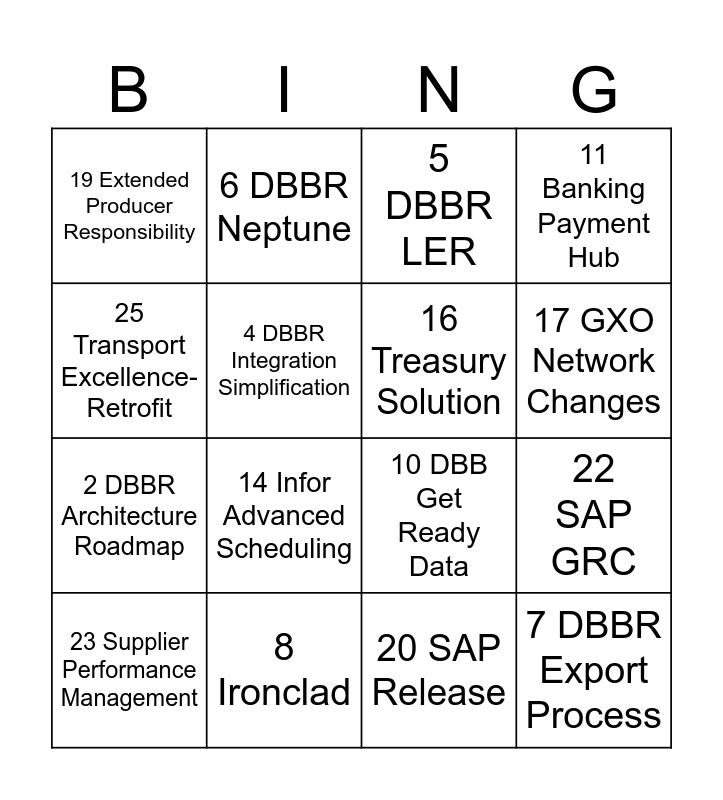 This bingo card has 27 words: Free!, 1 DBBR Commercial Policies, 2 DBBR Architecture Roadmap, 3 DBBR Data Readiness, 4 DBBR Integration Simplification, 5 DBBR LER, 6 DBBR Neptune, 7 DBBR Export Process, 8 Ironclad, 9 Zero Touch Ordering, 10 DBB Get Ready Data, 11 Banking Payment Hub, 12 Blue Yonder Supply Planning, 13 Celonis Process Mining, 14 Infor Advanced Scheduling, 15 Risk Management - IRM Solution, 16 Treasury Solution, 17 GXO Network Changes, 18 Keg Circulation, 19 Extended Producer Responsibility, 20 SAP Release, 21 Payroll Migration, 22 SAP GRC, 23 Supplier Performance Management, 24 Tally Ho, 25 Transport Excellence- Retrofit and 26 Workplace replacement.