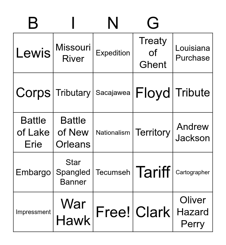 This bingo card has 25 words: Embargo, War Hawk, Nationalism, Clark, Louisiana Purchase, Lewis, Missouri River, Expedition, Territory, Cartographer, Corps, Tributary, Free!, Tariff, Tribute, Impressment, Battle of New Orleans, Sacajawea, Floyd, Andrew Jackson, Battle of Lake Erie, Star Spangled Banner, Tecumseh, Treaty of Ghent and Oliver Hazard Perry.
