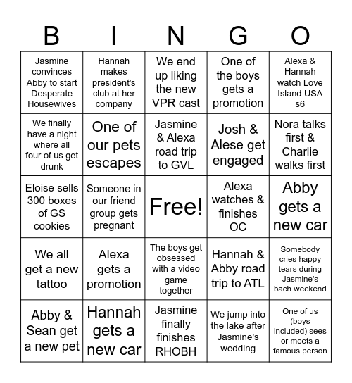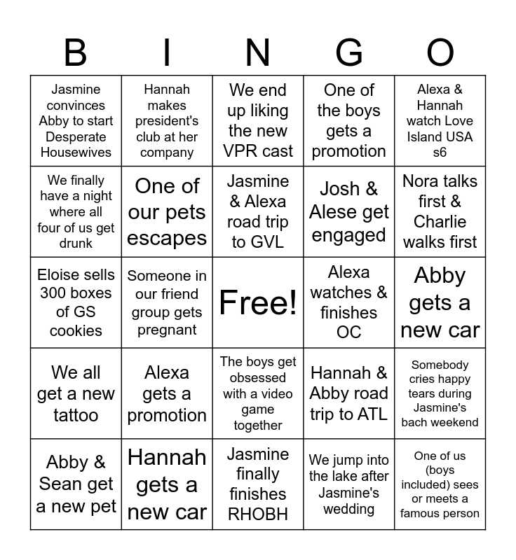 This bingo card has a free space and 24 words: Alexa gets a promotion, Hannah gets a new car, Jasmine & Alexa road trip to GVL, Abby & Sean get a new pet, Alexa & Hannah watch Love Island USA s6, Jasmine convinces Abby to start Desperate Housewives, We finally have a night where all four of us get drunk, Hannah makes president's club at her company, Alexa watches & finishes OC, The boys get obsessed with a video game together, Josh & Alese get engaged, Eloise sells 300 boxes of GS cookies, Hannah & Abby road trip to ATL, Somebody cries happy tears during Jasmine's bach weekend, One of our pets escapes, We jump into the lake after Jasmine's wedding, Abby gets a new car, We end up liking the new VPR cast, Nora talks first & Charlie walks first, Someone in our friend group gets pregnant, One of us (boys included) sees or meets a famous person, We all get a new tattoo, One of the boys gets a promotion and Jasmine finally finishes RHOBH.