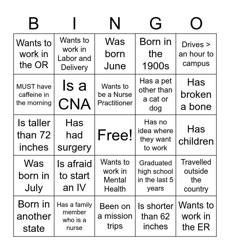 This bingo card has a free space and 24 words: Born in another state, Is afraid to start an IV, Wants to be a Nurse Practitioner, Is shorter than 62 inches, Drives > an hour to campus, Wants to work in the OR, Wants to work in Labor and Delivery, Was born June, Has no idea where they want to work, Has children, Is taller than 72 inches, Is a CNA, Graduated high school in the last 5 years, Travelled outside the country, MUST have caffeine in the morning, Has a family member who is a nurse, Been on a mission trips, Born in the 1900s, Has broken a bone, Was born in July, Has had surgery, Wants to work in Mental Health, Has a pet other than a cat or dog and Wants to work in the ER.