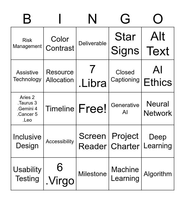 This bingo card has a free space and 31 words: Milestone, Stakeholder, Timeline, Scope, Risk Management, Deliverable, Resource Allocation, Project Charter, Generative AI, Machine Learning, Neural Network, Algorithm, Data Set, Automation, AI Ethics, Predictive Model, Deep Learning, Accessibility, Inclusive Design, Screen Reader, Alt Text, WCAG (Web Content Accessibility Guidelines), Usability Testing, Color Contrast, Closed Captioning, Assistive Technology, Star Signs, Aries 2 .Taurus 3 .Gemini 4 .Cancer 5 .Leo, 6 .Virgo, 7 .Libra and 8 .Scorpio.