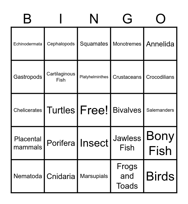 This bingo card has a free space and 24 words: Porifera, Cnidaria, Platyhelminthes, Nematoda, Annelida, Echinodermata, Gastropods, Cephalopods, Bivalves, Insect, Crustaceans, Chelicerates, Jawless Fish, Bony Fish, Cartilaginous Fish, Frogs and Toads, Salemanders, Squamates, Crocodilians, Turtles, Birds, Placental mammals, Monotremes and Marsupials.