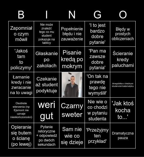This bingo card has a free space and 24 words: weri gut, Pytanie retoryczne + odpowiedź po dwóch sekundach, Pisanie kredą po mokrym, Opieranie się butem o ścianę (po lewej), Błędy w prostych obliczeniach, Zapomniał o czym mówił, 'Jakoś tam to policzymy', Nie może znaleźć tego co mu student pokazuje na tablicy, 'On tak na prawdę tego nie wymyślił', Czarny sweter, 'Pan ma zawsze dobre pytania', Łamanie kredy i nie zwracanie na to uwagi, Nie wie o co chodzi w pytaniu studenta, 'Jak ktoś kocha to...', Głaskanie po zakolach, 'Przeżyjmy ten przykład', Anegdotka o biednym studencie/matematyku, Popełnienie błędu i nie zauważenie, Ścieranie kredy paluchami, Czekanie aż student podyktuje, Dramatyczna pauza, Osobiste wierzenia (np Ejsmont nie uznaje nieskończoności), 'I to jest bardzo dobre pytanie' and Sam nie wie co się dzieje.