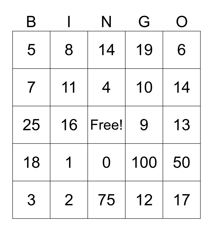 This bingo card has a free space and 24 words: 1, 2, 4, 3, 6, 5, 7, 8, 9, 0, 10, 25, 100, 50, 11, 12, 13, 14, 14, 16, 17, 18, 19 and 75.