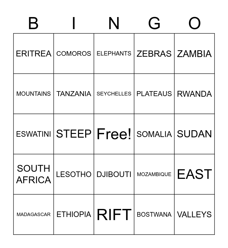 This bingo card has a free space and 34 words: KENYA, BOSTWANA, MALAWI, NAMIBIA, SOUTH AFRICA, TANZANIA, ZAMBIA, MADAGASCAR, COMOROS, MAURITIUS, SEYCHELLES, ELEPHANTS, GIRAFFES, UGANDA, SOMALIA, RWANDA, ETHIOPIA, ESWATINI, LESOTHO, MOZAMBIQUE, DJIBOUTI, BURUNDI, ERITREA, SUDAN, RIFT, VALLEYS, ZEBRAS, DESERT, PLATEAUS, MOUNTAINS, GRASSLANDS, STEEP, EAST and SOUTHERN.