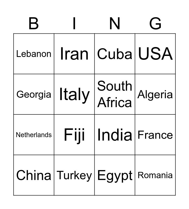 This bingo card has 42 words: Albania, Algeria, Australia, Belgium, Bosnia and Herzegovina, Brazil, China, Colombia, Cuba, Denmark, Egypt, Fiji, France, Georgia, Germany, Greece, Iceland, India, Indonesia, Iran, Italy, Jamaica, Japan, Lebanon, Mali, Mongolia, Netherlands, New Zealand, Nigeria, Portugal, Puerto Rico, Romania, South Africa, South Korea, Spain, Sweden, Switzerland, Turkey, Ukraine, United Kingdom, USA and Vietnam.