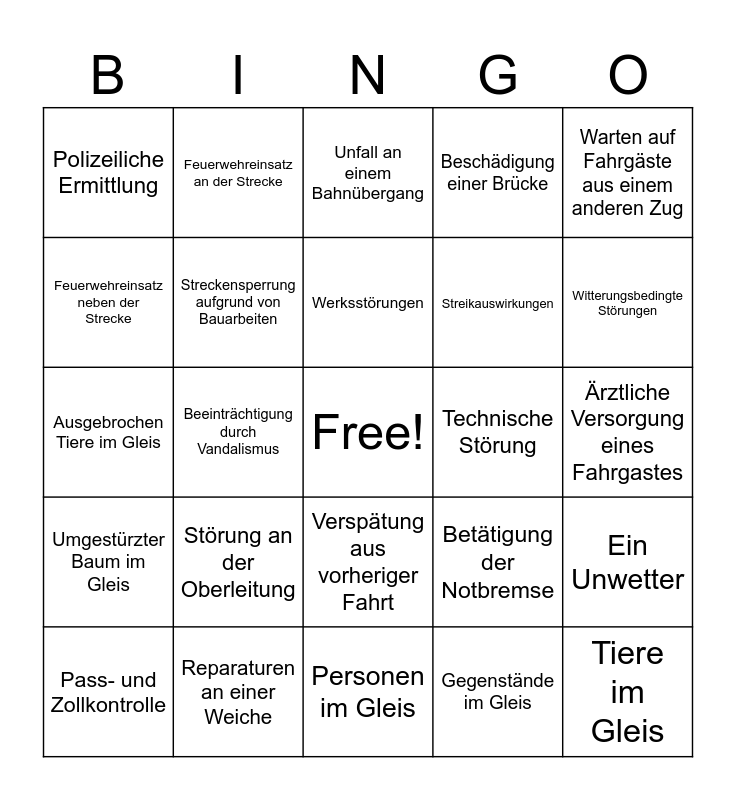 This bingo card has a free space and 26 words: Verspätung aus vorheriger Fahrt, Gegenstände im Gleis, Werksstörungen, Reparaturen an einer Weiche, Warten auf Fahrgäste aus einem anderen Zug, Polizeiliche Ermittlung, Feuerwehreinsatz neben der Strecke, Feuerwehreinsatz an der Strecke, Ärztliche Versorgung eines Fahrgastes, Betätigung der Notbremse, Streikauswirkungen, Ausgebrochen Tiere im Gleis, Ein Unwetter, Pass- und Zollkontrolle, Beeinträchtigung durch Vandalismus, Entschärfen einer Fliegerbombe, Beschädigung einer Brücke, Umgestürzter Baum im Gleis, Unfall an einem Bahnübergang, Tiere im Gleis, Witterungsbedingte Störungen, Personen im Gleis, Technische Störung, Störung an der Oberleitung, Streckensperrung aufgrund von Bauarbeiten and Notarzteinsatz am Gleis.