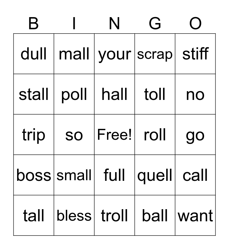 This bingo card has a free space and 24 words: small, bless, hall, tall, stiff, dull, stall, mall, roll, full, toll, trip, quell, call, poll, ball, go, your, no, so, want, boss, scrap and troll.